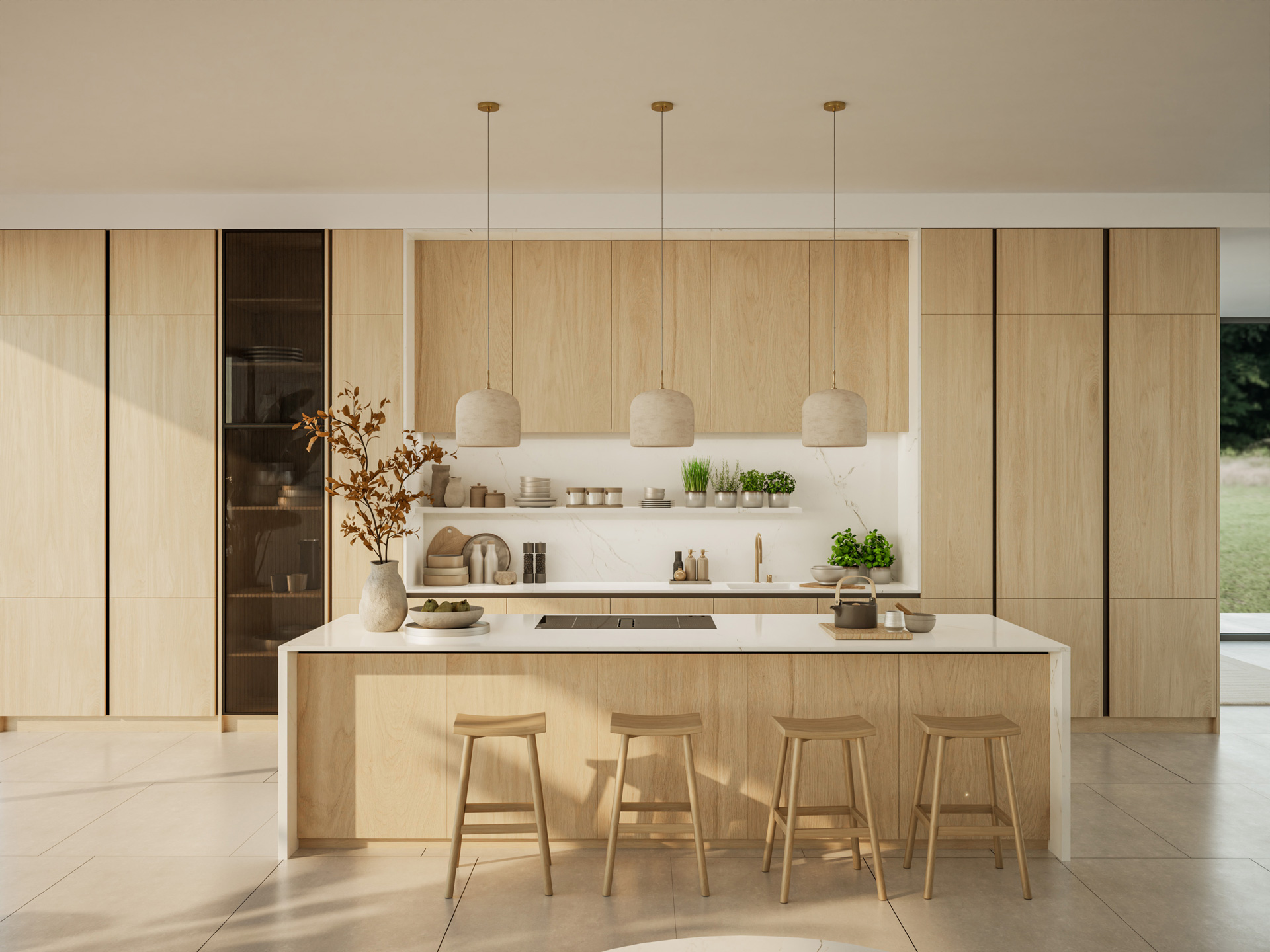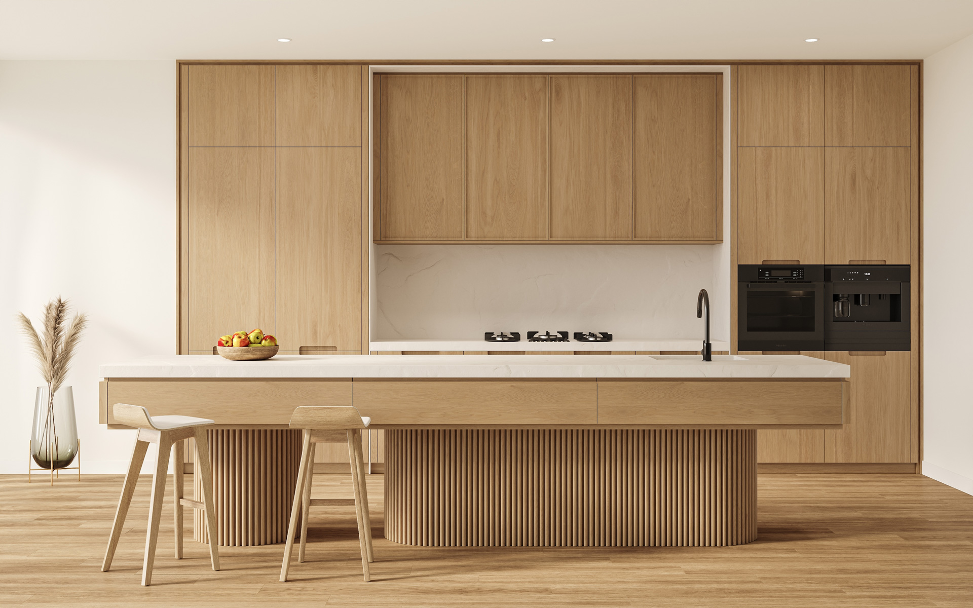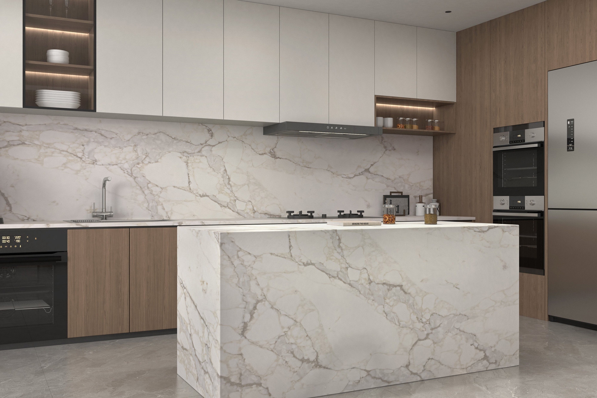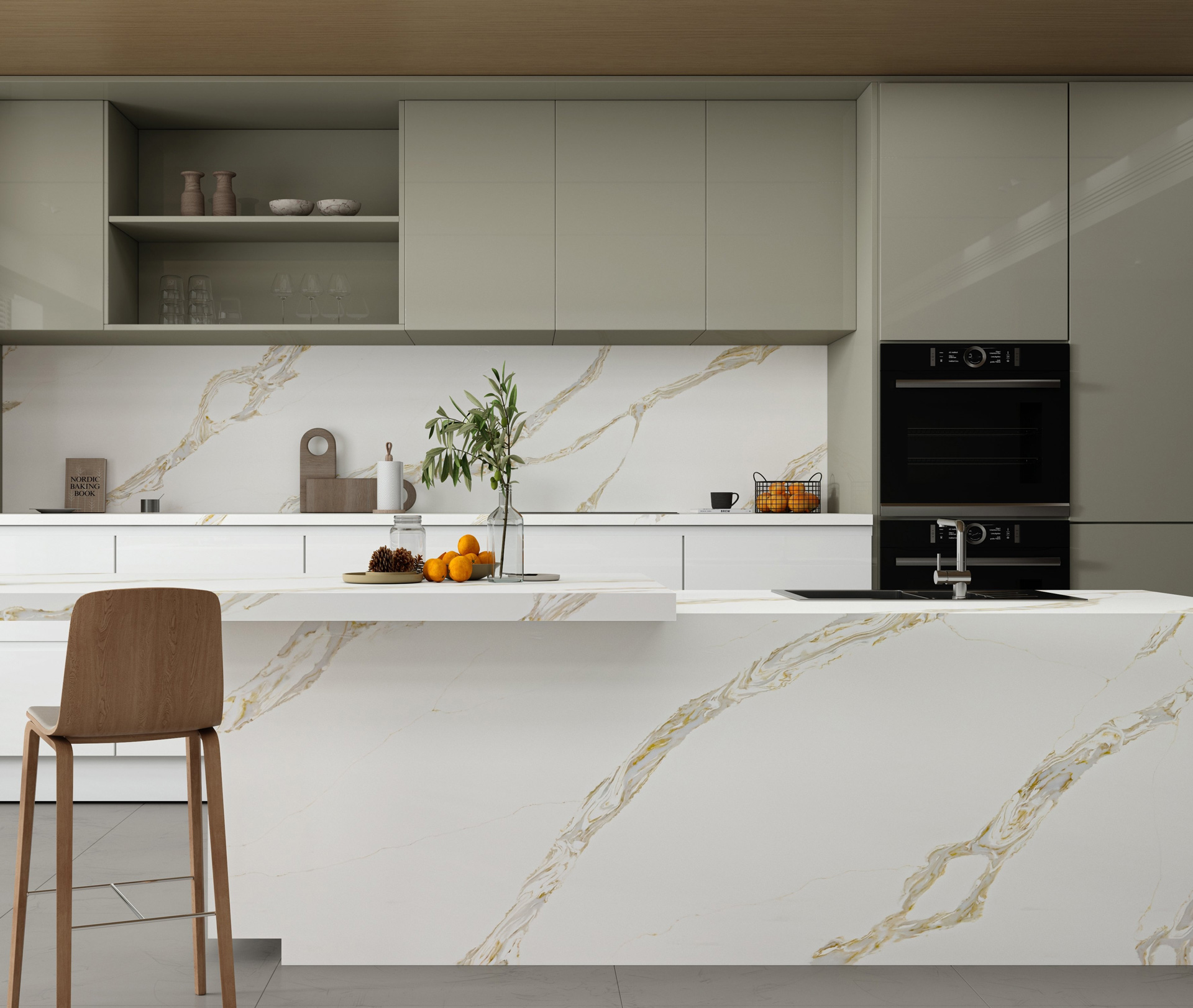 Эти поверхности хорошо подходят для монохромных кухонь и пространств, где важен ритм и чистота линий.