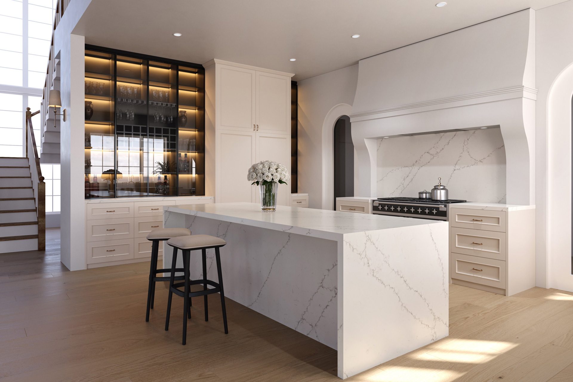 Кухонный остров или барная стойка - ещё один удачный сценарий. Cloud Dancer здесь работает как объединяющий элемент. Он связывает зону готовки и зону общения, не перетягивая внимание на себя. Особенно эффектно смотрятся острова с большой столешницей и аккуратными торцами, где цвет раскрывается на объёме.