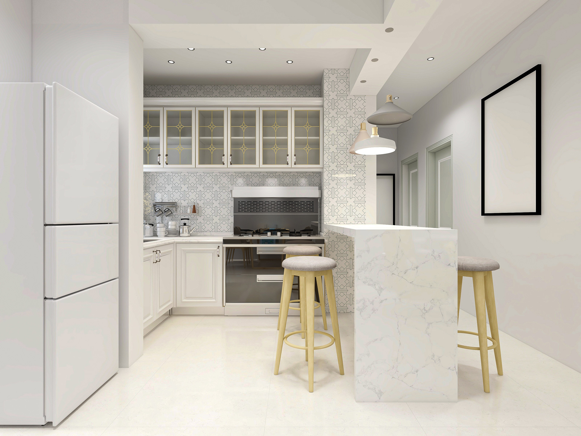 Фартуки чаще всего делают либо максимально нейтральными, либо с лёгкой графикой, чтобы поверхность не дробила пространство. В результате кухня выглядит монолитной и светлой даже при сложной планировке.