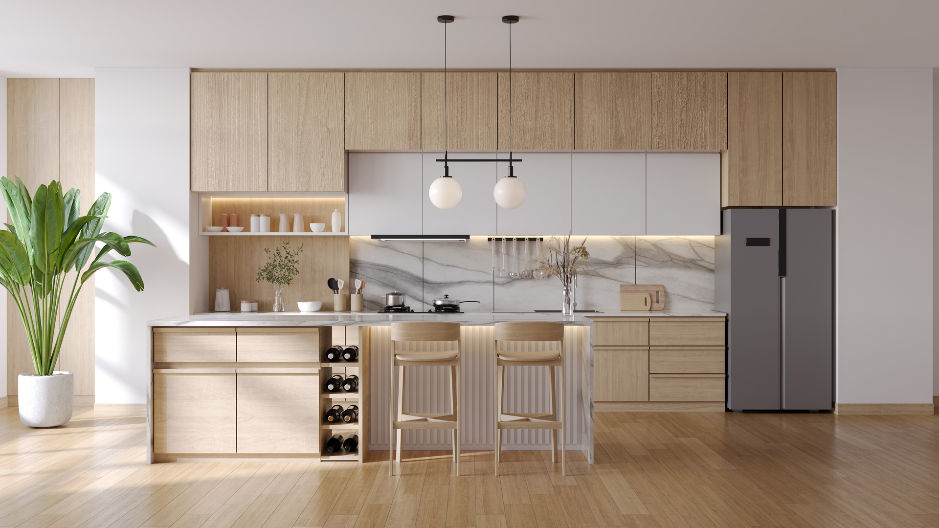 Каменные декоры можно сочетать и с более холодной древесиной: выбеленный дуб, серые или дымчатые тона. В этом случае интерьер становится строже. Cloud Dancer сглаживает холод дерева и не даёт пространству выглядеть жёстко или офисно. Такой дуэт хорошо работает в современных минималистичных проектах.