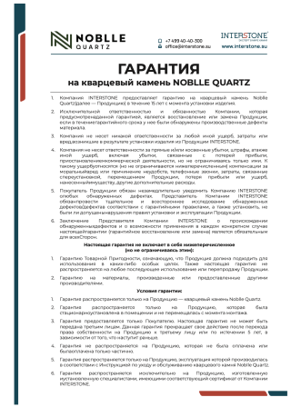 Кварцевый камень Noblle Quartz защищен гарантией на протяжении 15 лет с момента установки изделия