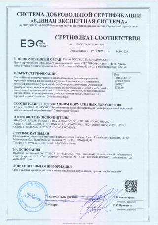 Подтверждает, что клей для искусственного камня «Акрид» соответствует требованиям нормативных документов по спецификации изготовителя